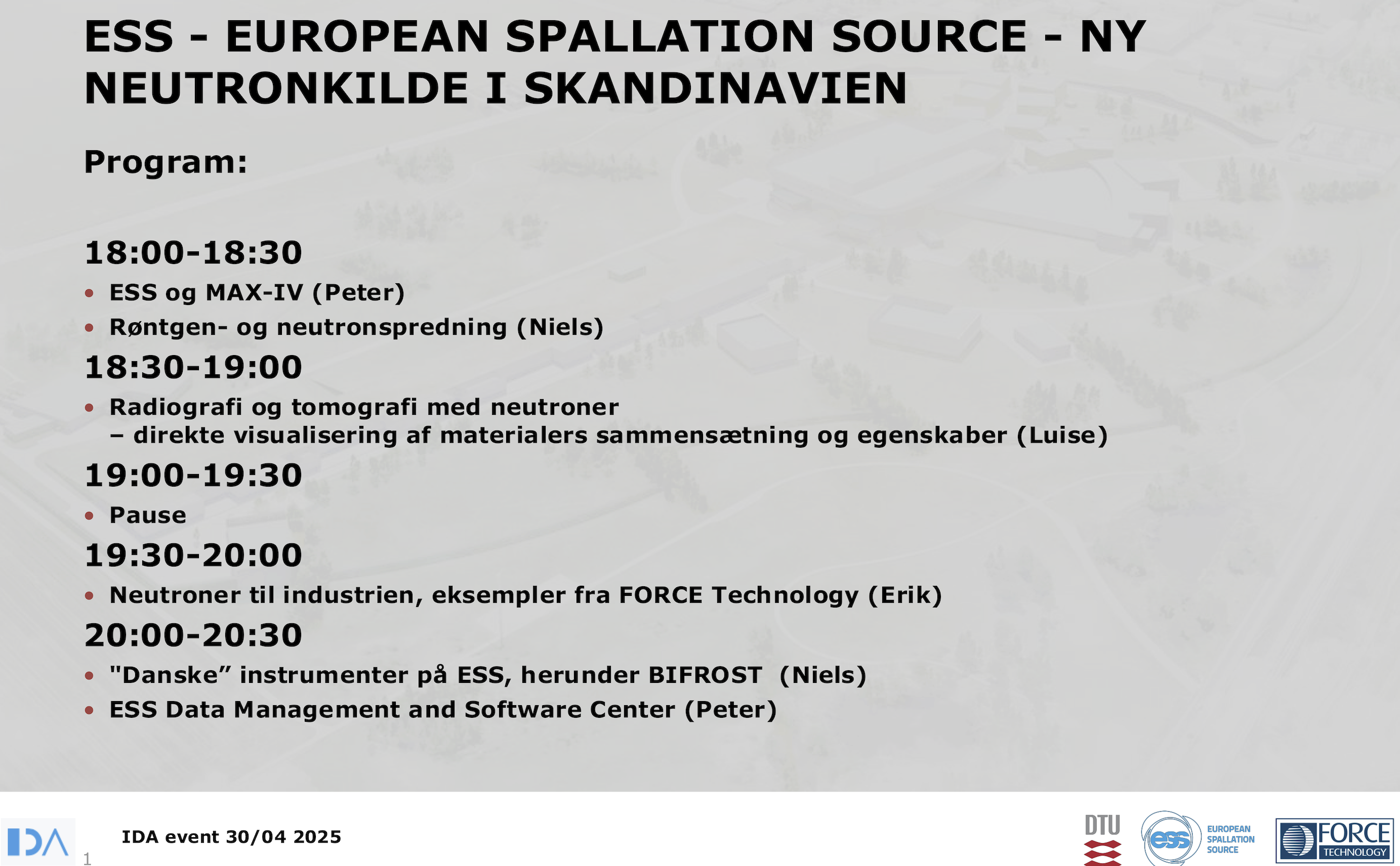 | ESS og MAX-IV - introduktion | Peter Kjær Willendrup, DTU Fysik og ESS DMSC | PPT | |